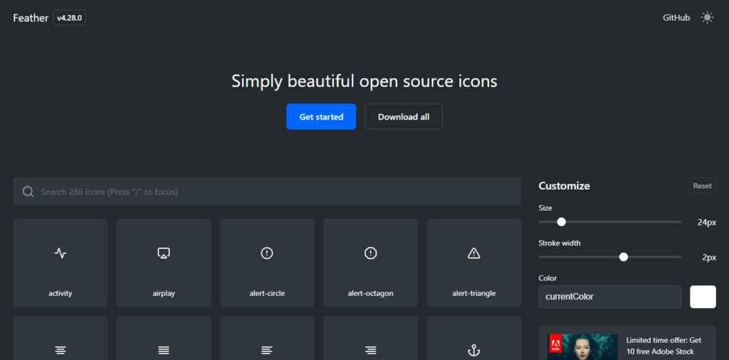يقدم Feather مجموعة من الايقونات الجميلة التي تعمل بسلاسة مع مشاريع JavaScript. يمكن تخصيص الحجم والخط الخارجي واللون بسهولة قبل التنزيل.