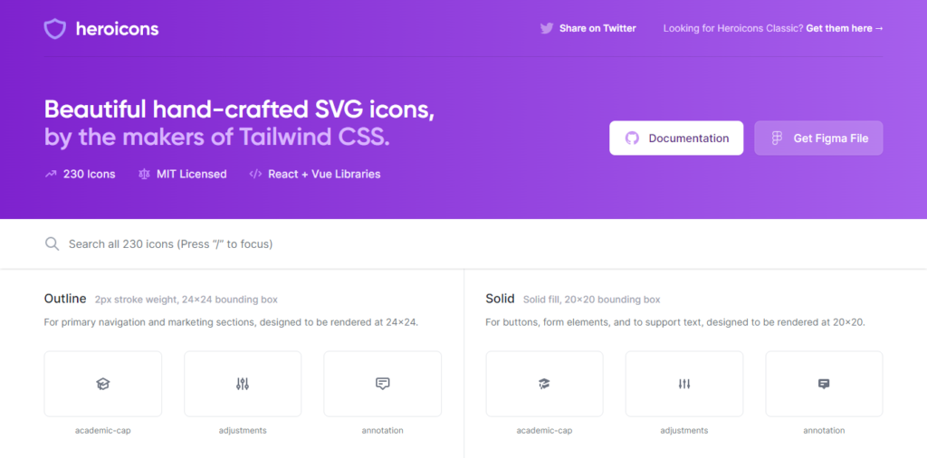 Heroicons عبارة عن مجموعة أيقونات جميلة مفتوحة المصدر مدعومة من Figma. إنه يوفر أيقونات معبأة ومحددة ، والقدرة على تنزيل الايقونة كـ SVG أو JSX بمجرد النقر على العنصر.