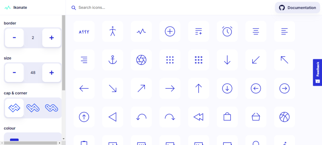 Ikonate هو ايقونات غني فريد من نوعه مع دعم SVG الكامل. على عكس المنافسين الآخرين ، فإن الموقع الرئيسي هو مجرد تطبيق تجريبي لجميع الايقونات وخيارات التخصيص الخاصة بهم.